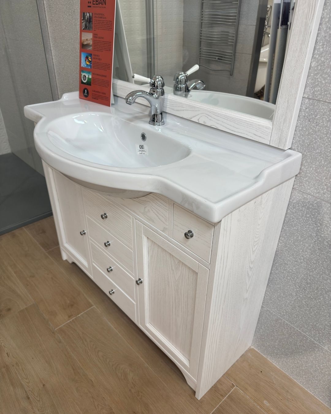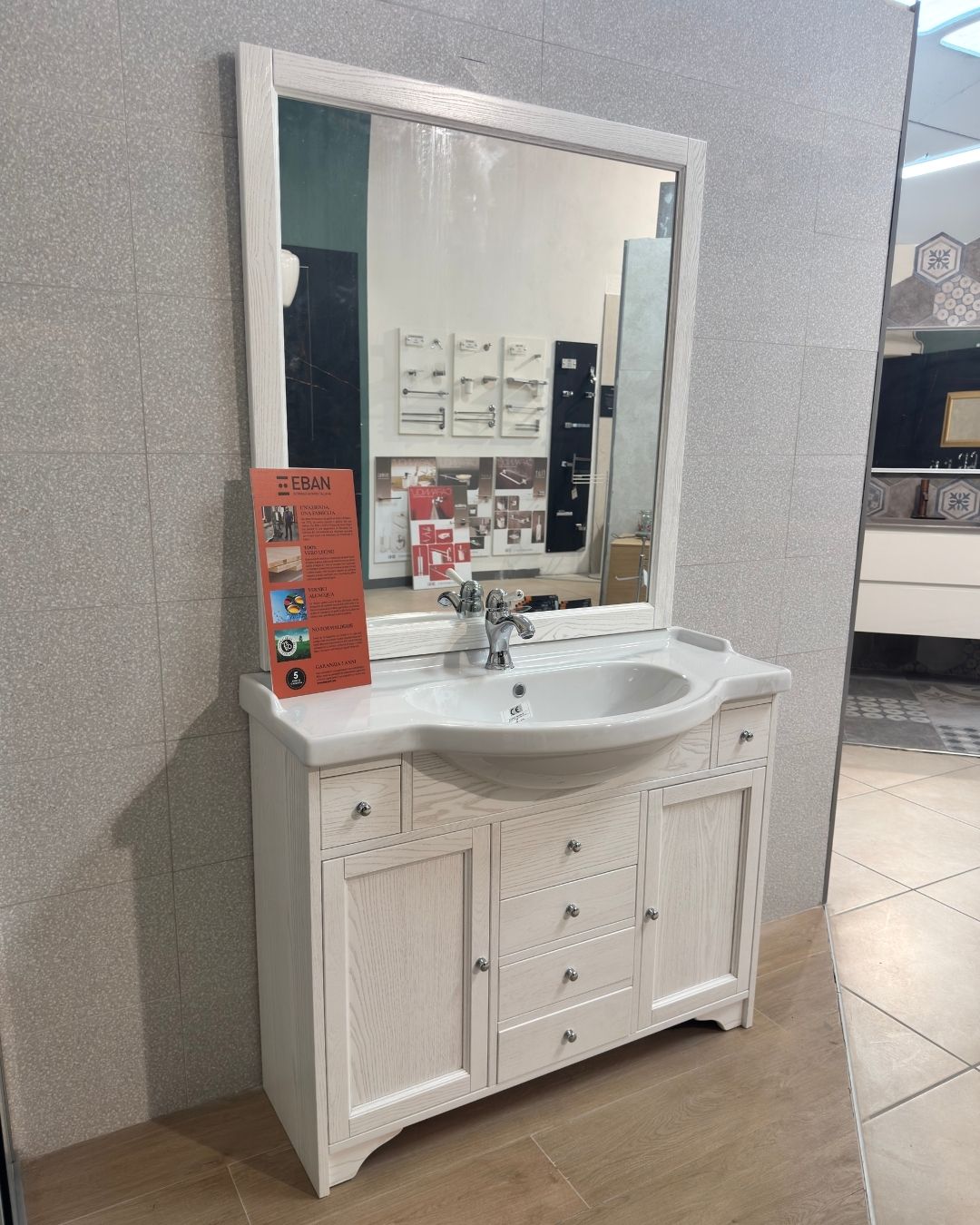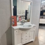 Mobile bagno in pronta consegna Eban collezione Eleonora, con specchiera inclusa, in vendita ad un prezzo promozionale per rinnovo showroom, misure: Lmax 104cm Pmax 50cm (lavabo) Pmin 33.5cm (mobile) x H87cm. Specchiera misure: 96cm x 102cm x 3cm. Prezzo 950€ iva inclusa – spedizioni in tutta Italia (da quotare separatamente) o ritiro immediato presso nostra sede. (Rubinetteria esclusa).