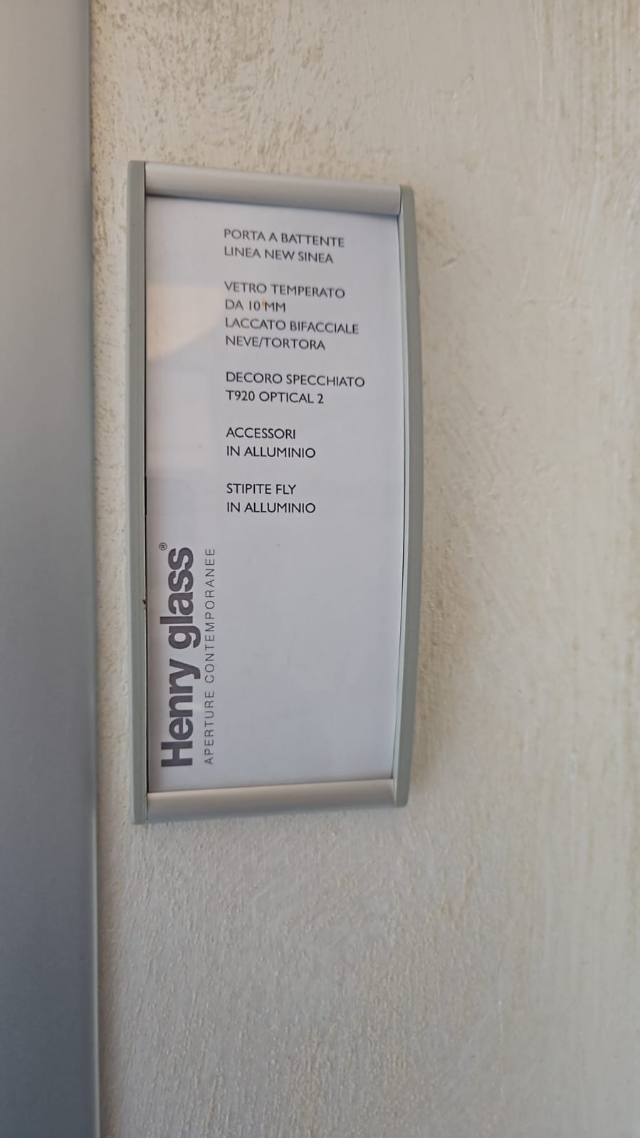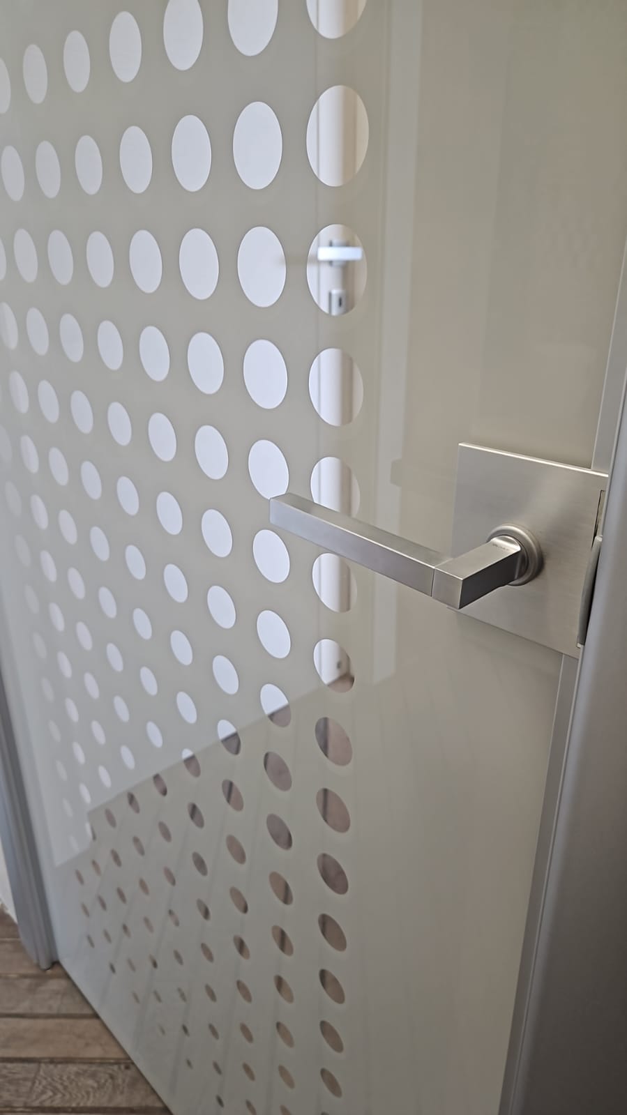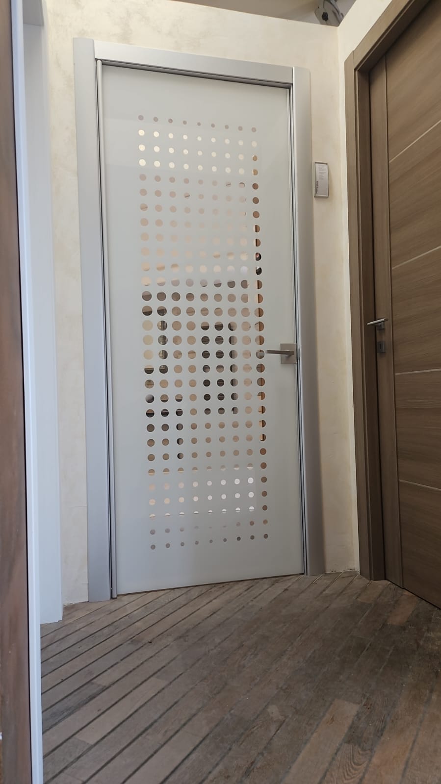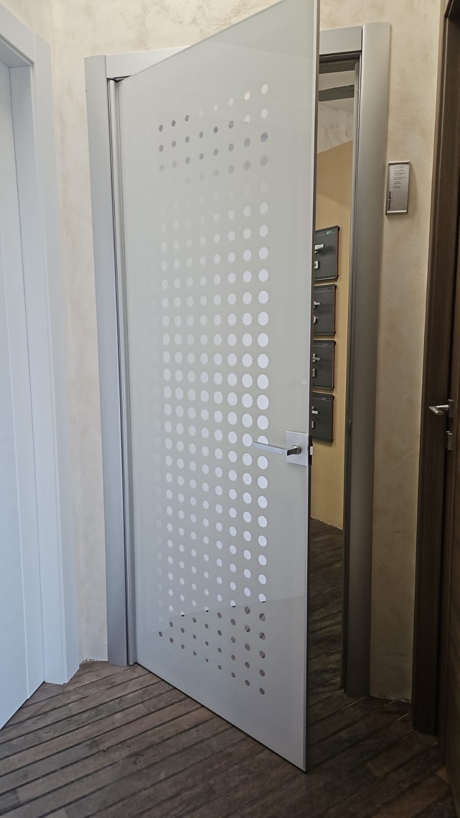 Porta New Sinea – HENRY GLASS da expo, pronta visione, porta per interni a battente in vetro temperato da 10mm, laccato bifacciale neve/tortora. Decoro specchiato T920 Optical 2, accessori e stipite Fly in alluminio.