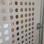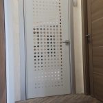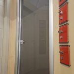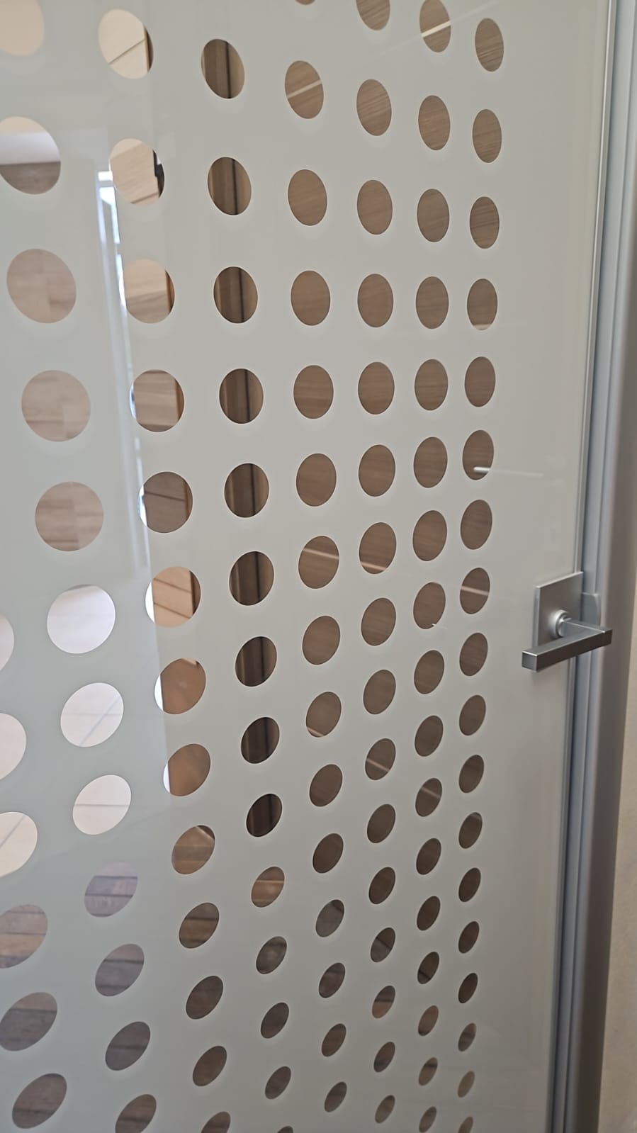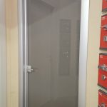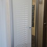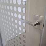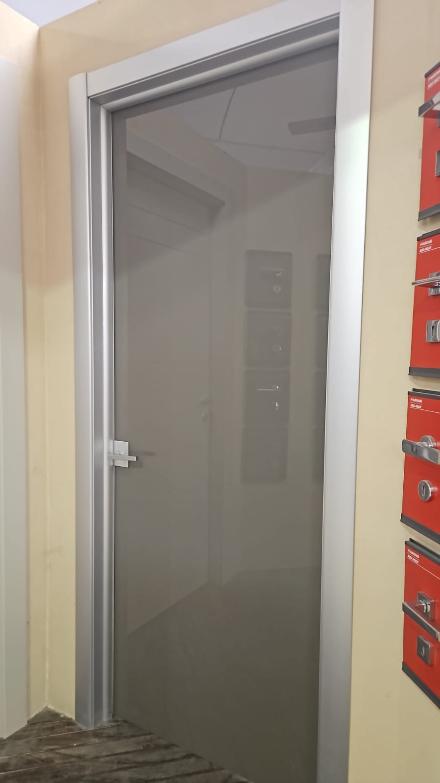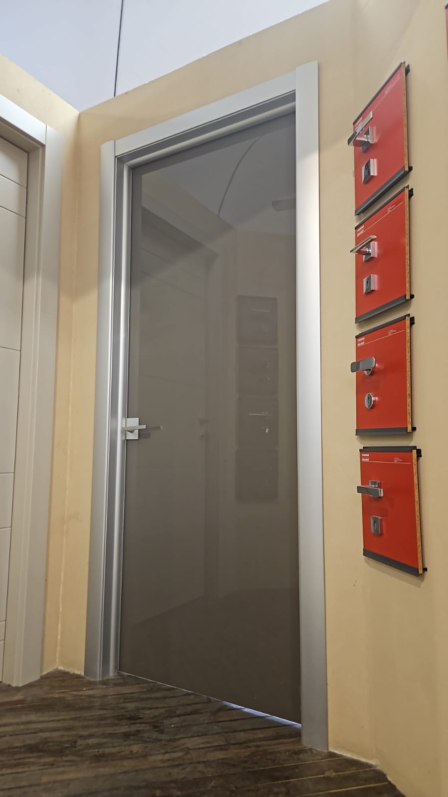 Porta New Sinea – HENRY GLASS da expo, pronta visione, porta per interni a battente in vetro temperato da 10mm, laccato bifacciale neve/tortora. Decoro specchiato T920 Optical 2, accessori e stipite Fly in alluminio.